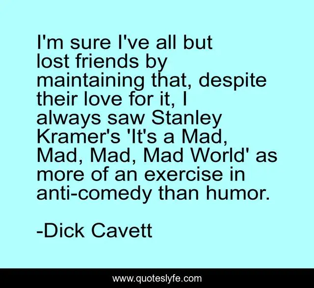 This page presents the quote "I'm sure I've all but lost friends by maintaining that, despite their love for it, I always saw Stanley Kramer's 'It's a Mad, Mad, Mad, Mad World' as more of an exercise in anti-comedy than humor.". Author of this quote is Dick Cavett. This quote is about love, friends, affection, world,.