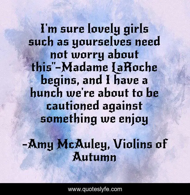 This page presents the quote "I'm sure lovely girls such as yourselves need not worry about this"—Madame LaRoche begins, and I have a hunch we're about to be cautioned against something we enjoy". Author of this quote is Amy McAuley, Violins of Autumn. This quote is about girl-power, humor, feminism,.