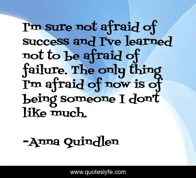 This page presents the quote "I'm sure not afraid of success and I've learned not to be afraid of failure. The only thing I'm afraid of now is of being someone I don't like much.". Author of this quote is Anna Quindlen. This quote is about now, afraid, success,.