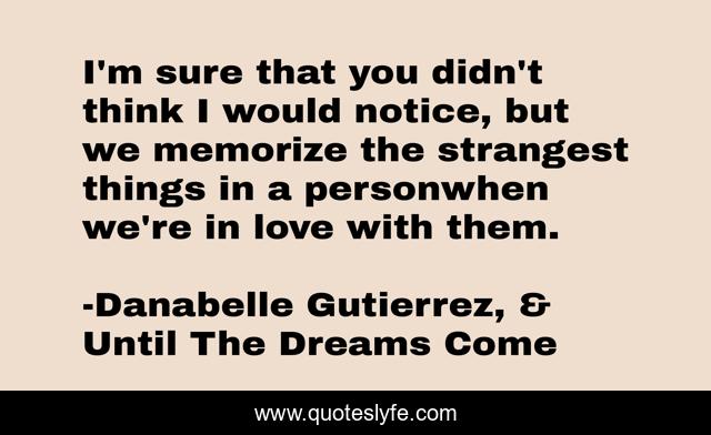 This page presents the quote "I'm sure that you didn't think I would notice, but we memorize the strangest things in a personwhen we're in love with them.". Author of this quote is Danabelle Gutierrez, & Until The Dreams Come. This quote is about strange, love, poetry, affection, memory,.