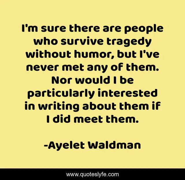 This page presents the quote "I'm sure there are people who survive tragedy without humor, but I've never met any of them. Nor would I be particularly interested in writing about them if I did meet them.". Author of this quote is Ayelet Waldman. This quote is about writing, tragedy, people,.
