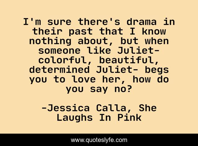 This page presents the quote "I'm sure there's drama in their past that I know nothing about, but when someone like Juliet- colorful, beautiful, determined Juliet- begs you to love her, how do you say no?". Author of this quote is Jessica Calla, She Laughs In Pink. This quote is about drama, romance, college, love, affection,.