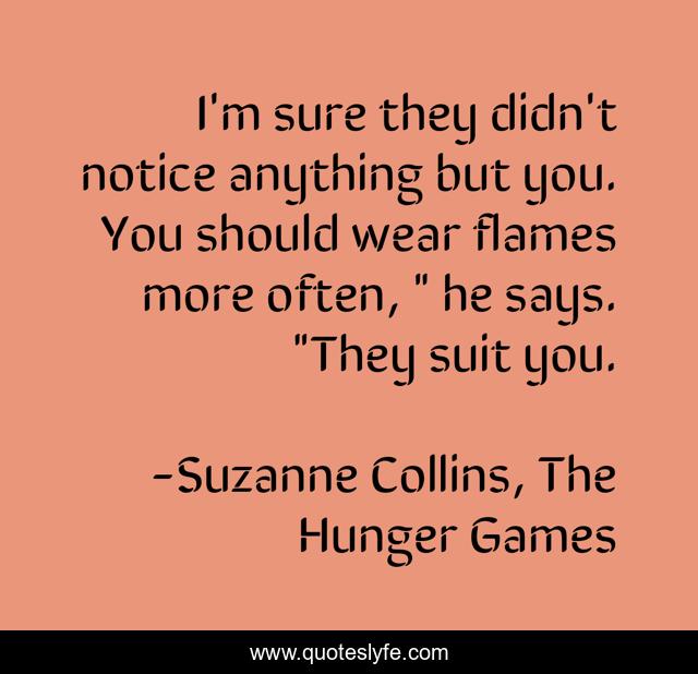 This page presents the quote "I'm sure they didn't notice anything but you. You should wear flames more often, " he says. "They suit you.". Author of this quote is Suzanne Collins, The Hunger Games. This quote is about attractiveness, fashion,.