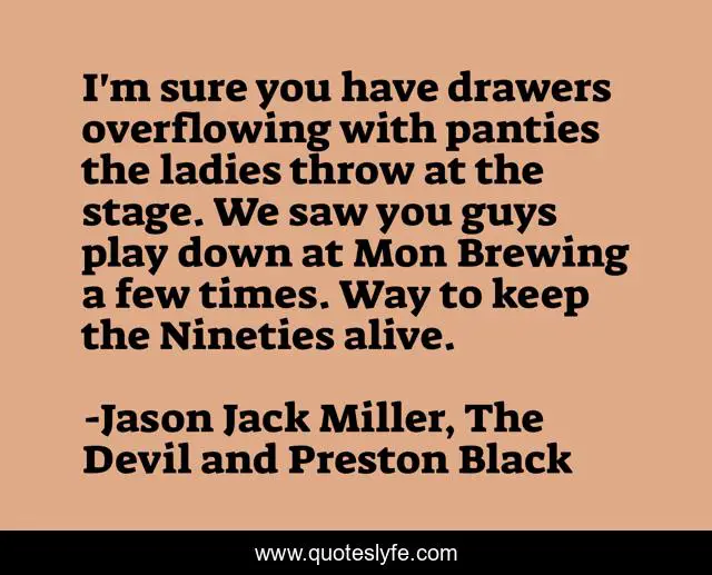 This page presents the quote "I'm sure you have drawers overflowing with panties the ladies throw at the stage. We saw you guys play down at Mon Brewing a few times. Way to keep the Nineties alive.". Author of this quote is Jason Jack Miller, The Devil and Preston Black. This quote is about jason-jack-miller, supernatural, appalachian-fiction, deal-with-the-devil, the-devil-and-preston-black, murder-ballads-and-whiskey,.
