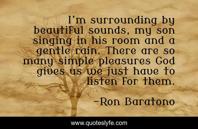 This page presents the quote "I’m surrounding by beautiful sounds, my son singing in his room and a gentle rain. There are so many simple pleasures God gives us we just have to listen for them.". Author of this quote is Ron Baratono. This quote is about beautiful, god, pleasures, son,.