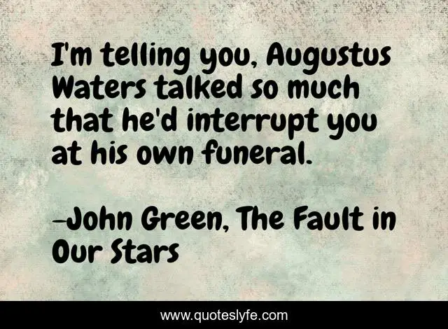 This page presents the quote "I'm telling you, Augustus Waters talked so much that he'd interrupt you at his own funeral.". Author of this quote is John Green, The Fault in Our Stars. This quote is about funny, funeral, augustus-waters, comedy,.