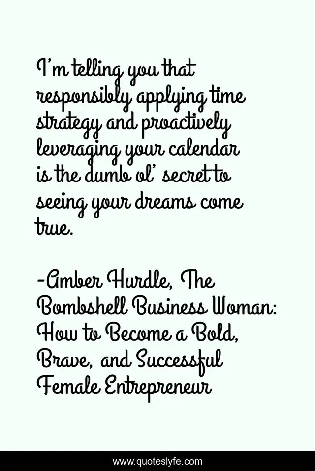 This page presents the quote "I’m telling you that responsibly applying time strategy and proactively leveraging your calendar is the dumb ol’ secret to seeing your dreams come true.". Author of this quote is Amber Hurdle, The Bombshell Business Woman: How to Become a Bold, Brave, and Successful Female Entrepreneur. This quote is about calendar, life, business, time-mangement,.