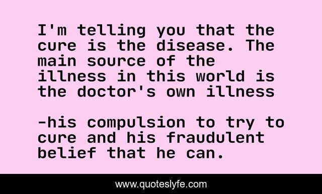 This page presents the quote "I'm telling you that the cure is the disease. The main source of the illness in this world is the doctor's own illness". Author of this quote is his compulsion to try to cure and his fraudulent belief that he can.. .