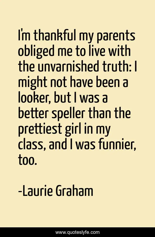 This page presents the quote "I'm thankful my parents obliged me to live with the unvarnished truth: I might not have been a looker, but I was a better speller than the prettiest girl in my class, and I was funnier, too.". Author of this quote is Laurie Graham. This quote is about girl, parents, truth,.