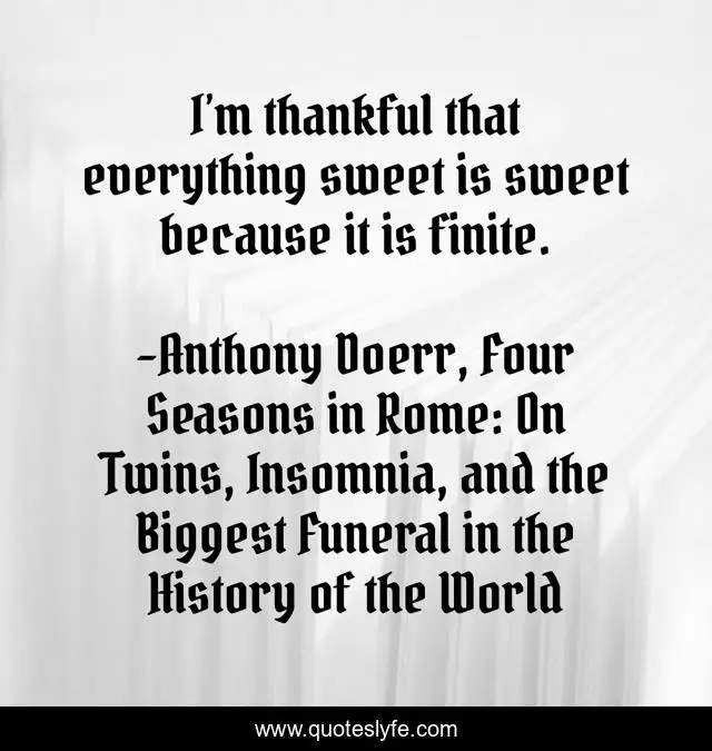 "Anthony Doerr, Four Seasons in Rome: On Twins, Insomnia, and the Biggest Funeral in the History of the World Quotes." Quoteslyfe.com, 2025. Mon. 08 Dec. 2025. <https://www.quoteslyfe.com/quote/I-m-thankful-that-everything-sweet-is-226750>.