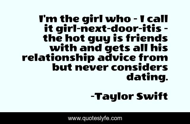 This page presents the quote "I'm the girl who - I call it girl-next-door-itis - the hot guy is friends with and gets all his relationship advice from but never considers dating.". Author of this quote is Taylor Swift. This quote is about girl, friends, relationship,.