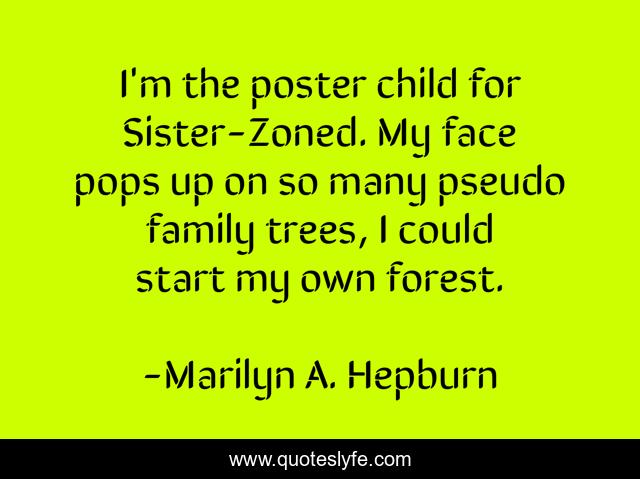 This page presents the quote "I'm the poster child for Sister-Zoned. My face pops up on so many pseudo family trees, I could start my own forest.". Author of this quote is Marilyn A. Hepburn. This quote is about love, sister-zone, friend-zoned, love-hurts, affection, disappointment,.