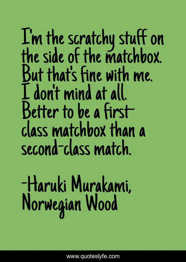 This page presents the quote "I'm the scratchy stuff on the side of the matchbox. But that's fine with me. I don't mind at all. Better to be a first-class matchbox than a second-class match.". Author of this quote is Haruki Murakami, Norwegian Wood. This quote is about human-nature, teaching, inspirational, enthusiasm,.