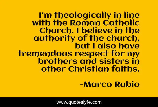 This page presents the quote "I'm theologically in line with the Roman Catholic Church. I believe in the authority of the church, but I also have tremendous respect for my brothers and sisters in other Christian faiths.". Author of this quote is Marco Rubio. This quote is about believe, christian,.