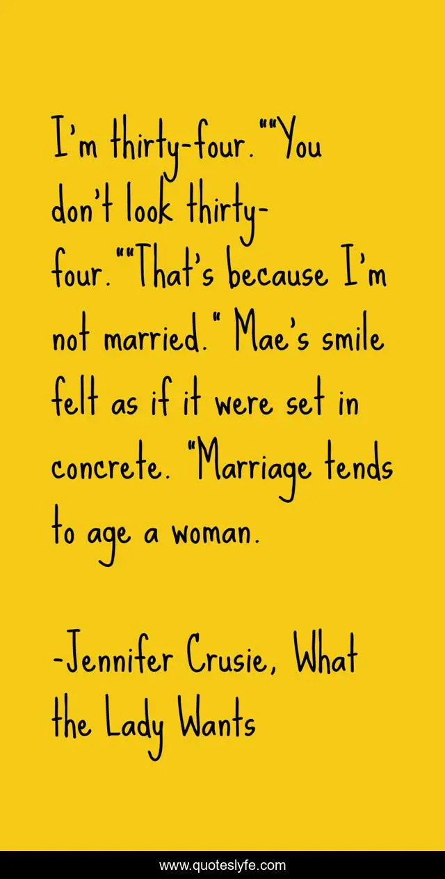 This page presents the quote "I'm thirty-four.""You don't look thirty-four.""That's because I'm not married." Mae's smile felt as if it were set in concrete. "Marriage tends to age a woman.". Author of this quote is Jennifer Crusie, What the Lady Wants. This quote is about youth, age, marriage,.