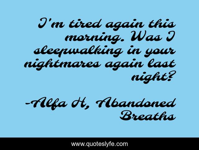This page presents the quote "I'm tired again this morning. Was I sleepwalking in your nightmares again last night?". Author of this quote is Alfa H, Abandoned Breaths. This quote is about relationships, life, love, poetry, affection,.