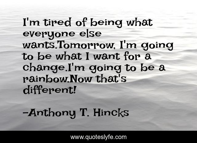 This page presents the quote "I'm tired of being what everyone else wants.Tomorrow, I'm going to be what I want for a change.I'm going to be a rainbow.Now that's different!". Author of this quote is Anthony T. Hincks. This quote is about wants, be, different, everyone, rainbow, being, colour, philosophy, else,.