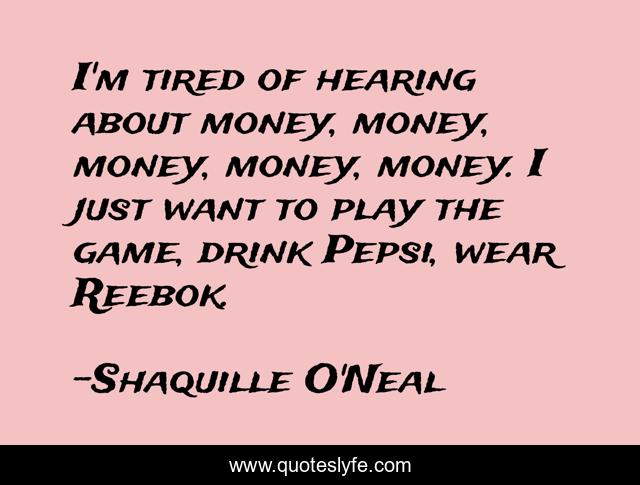 This page presents the quote "I'm tired of hearing about money, money, money, money, money. I just want to play the game, drink Pepsi, wear Reebok.". Author of this quote is Shaquille O'Neal. This quote is about money, game, tired,.