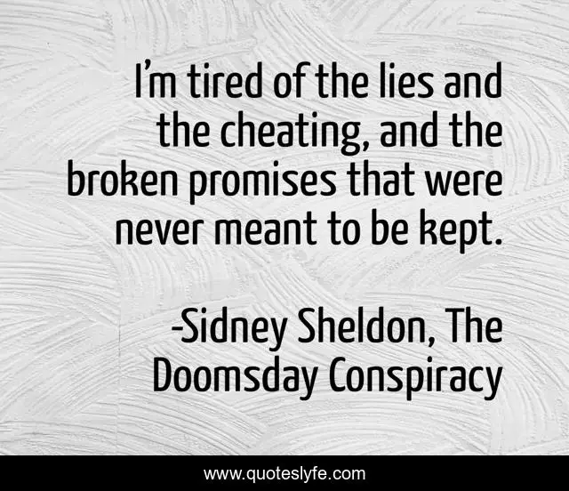 This page presents the quote "I’m tired of the lies and the cheating, and the broken promises that were never meant to be kept.". Author of this quote is Sidney Sheldon, The Doomsday Conspiracy. This quote is about lies, promises, truth,.