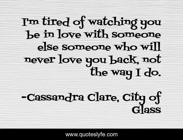 This page presents the quote "I'm tired of watching you be in love with someone else someone who will never love you back, not the way I do.". Author of this quote is Cassandra Clare, City of Glass. This quote is about magnus-bane, sweet,.
