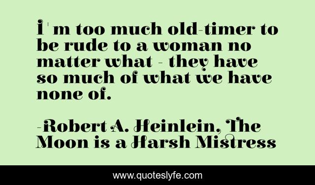 This page presents the quote "I'm too much old-timer to be rude to a woman no matter what - they have so much of what we have none of.". Author of this quote is Robert A. Heinlein, The Moon is a Harsh Mistress. .