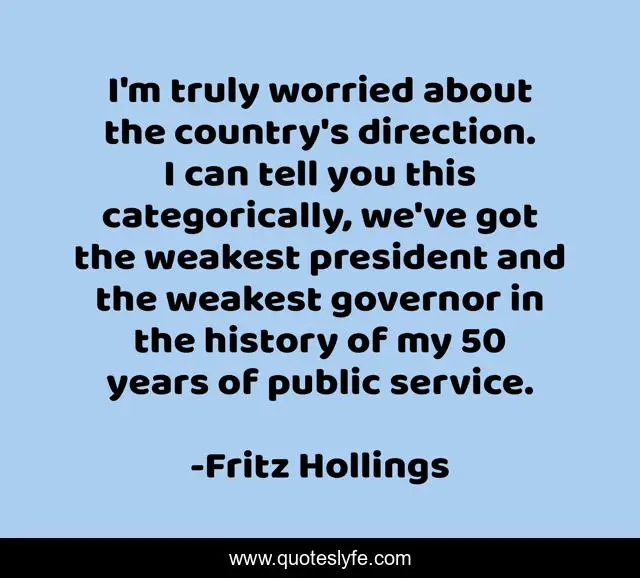 This page presents the quote "I'm truly worried about the country's direction. I can tell you this categorically, we've got the weakest president and the weakest governor in the history of my 50 years of public service.". Author of this quote is Fritz Hollings. This quote is about public service, service,.