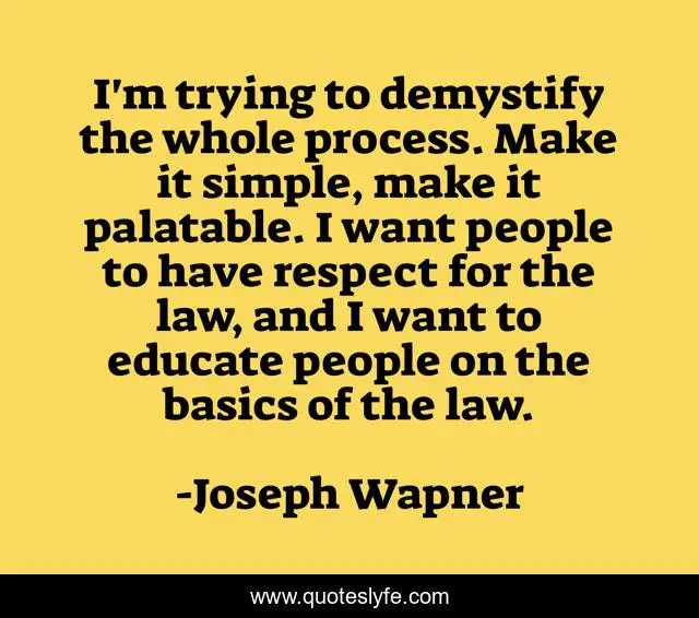 This page presents the quote "I'm trying to demystify the whole process. Make it simple, make it palatable. I want people to have respect for the law, and I want to educate people on the basics of the law.". Author of this quote is Joseph Wapner. This quote is about simple, law, people,.