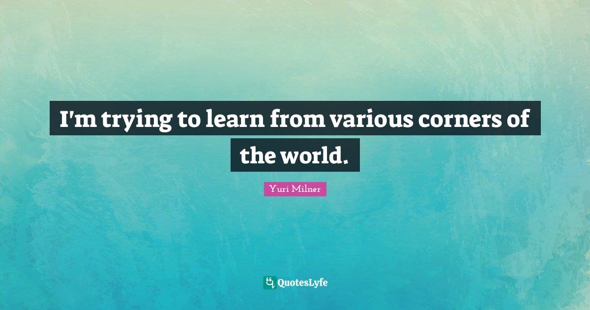 This page presents the quote "I'm trying to learn from various corners of the world.". Author of this quote is Yuri Milner. This quote is about world, various, corners of the world, trying,.