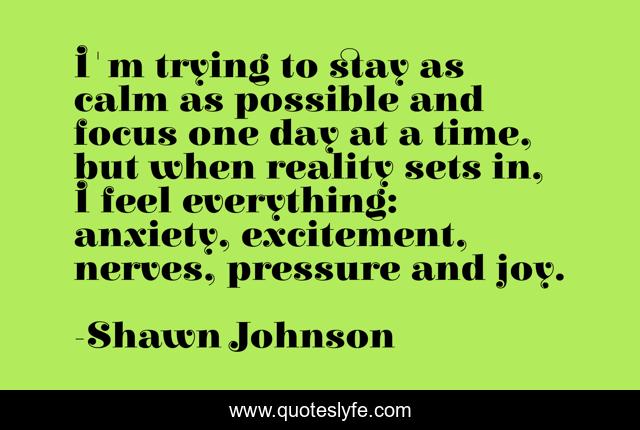 This page presents the quote "I'm trying to stay as calm as possible and focus one day at a time, but when reality sets in, I feel everything: anxiety, excitement, nerves, pressure and joy.". Author of this quote is Shawn Johnson. This quote is about joy, day, focus,.