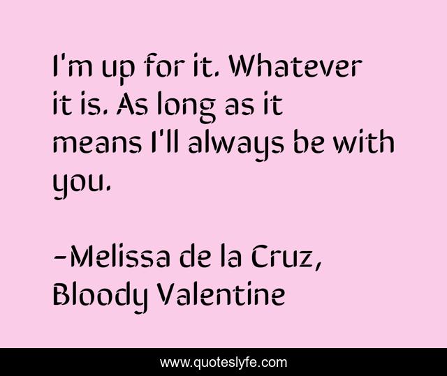 This page presents the quote "I'm up for it. Whatever it is. As long as it means I'll always be with you.". Author of this quote is Melissa de la Cruz, Bloody Valentine. This quote is about bloody-valentine, love, affection, lover,.