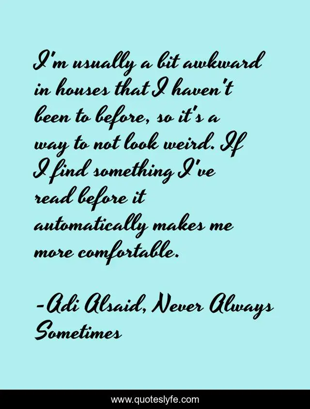 This page presents the quote "I'm usually a bit awkward in houses that I haven't been to before, so it's a way to not look weird. If I find something I've read before it automatically makes me more comfortable.". Author of this quote is Adi Alsaid, Never Always Sometimes. This quote is about me, awkward, comfort, books, truth, true, book,.