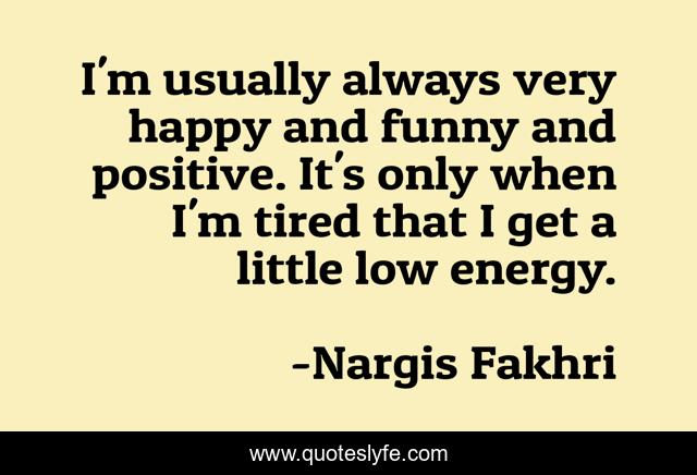 This page presents the quote "I'm usually always very happy and funny and positive. It's only when I'm tired that I get a little low energy.". Author of this quote is Nargis Fakhri. This quote is about funny, comedy, happy, tired,.