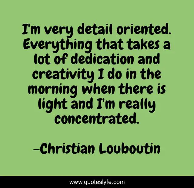 This page presents the quote "I'm very detail oriented. Everything that takes a lot of dedication and creativity I do in the morning when there is light and I'm really concentrated.". Author of this quote is Christian Louboutin. This quote is about light, creativity,.