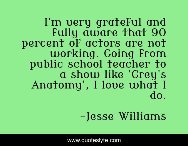 This page presents the quote "I'm very grateful and fully aware that 90 percent of actors are not working. Going from public school teacher to a show like 'Grey's Anatomy', I love what I do.". Author of this quote is Jesse Williams. This quote is about school, love, grateful, affection,.
