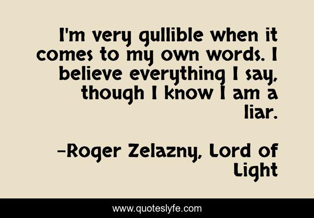 This page presents the quote "I'm very gullible when it comes to my own words. I believe everything I say, though I know I am a liar.". Author of this quote is Roger Zelazny, Lord of Light. This quote is about inspirational, truth, reality, gullible, lies, words, enthusiasm,.