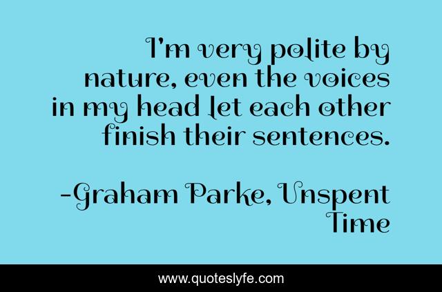 This page presents the quote "I'm very polite by nature, even the voices in my head let each other finish their sentences.". Author of this quote is Graham Parke, Unspent Time. This quote is about weird, philosophy, humor,.