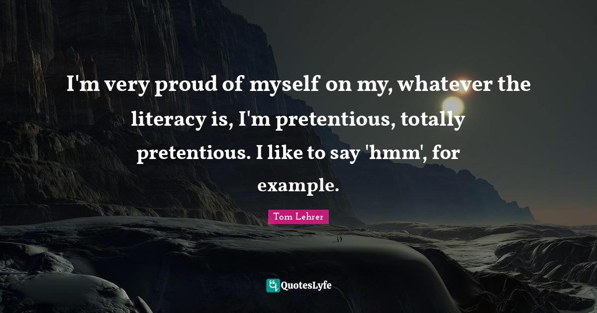 This page presents the quote "I'm very proud of myself on my, whatever the literacy is, I'm pretentious, totally pretentious. I like to say 'hmm', for example.". Author of this quote is Tom Lehrer. This quote is about example, proud, pretentious, literacy, proud of myself, hmm,.
