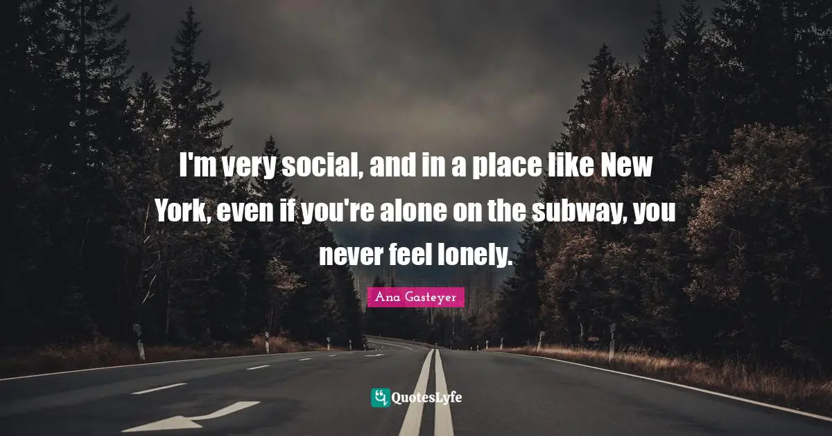 This page presents the quote "I'm very social, and in a place like New York, even if you're alone on the subway, you never feel lonely.". Author of this quote is Ana Gasteyer. This quote is about new york, social, lonely, subway,.