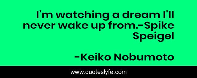 This page presents the quote "I'm watching a dream I'll never wake up from.-Spike Speigel". Author of this quote is Keiko Nobumoto. This quote is about life, cowboy-bebop, spike-speigel, dreams, steven-blum,.