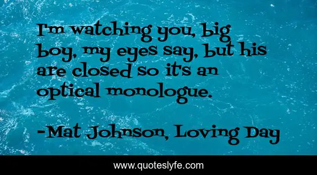This page presents the quote "I'm watching you, big boy, my eyes say, but his are closed so it's an optical monologue.". Author of this quote is Mat Johnson, Loving Day. .