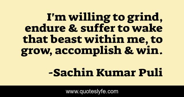 This page presents the quote "I'm willing to grind, endure & suffer to wake that beast within me, to grow, accomplish & win.". Author of this quote is Sachin Kumar Puli. This quote is about life, win, winning, suffering, accomplishments, endure, life-lessons, endure-pain, suffering-of-humanity,.