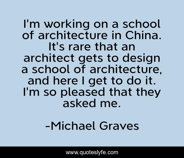This page presents the quote "I'm working on a school of architecture in China. It's rare that an architect gets to design a school of architecture, and here I get to do it. I'm so pleased that they asked me.". Author of this quote is Michael Graves. This quote is about me, school, design,.