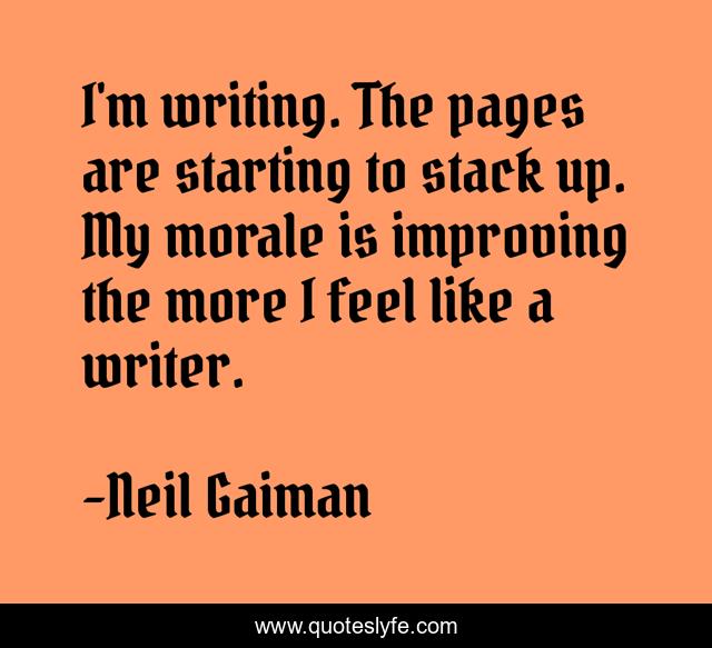 This page presents the quote "I'm writing. The pages are starting to stack up. My morale is improving the more I feel like a writer.". Author of this quote is Neil Gaiman. This quote is about writing, writing-life, writing-craft, writing-process, writing-advice,.