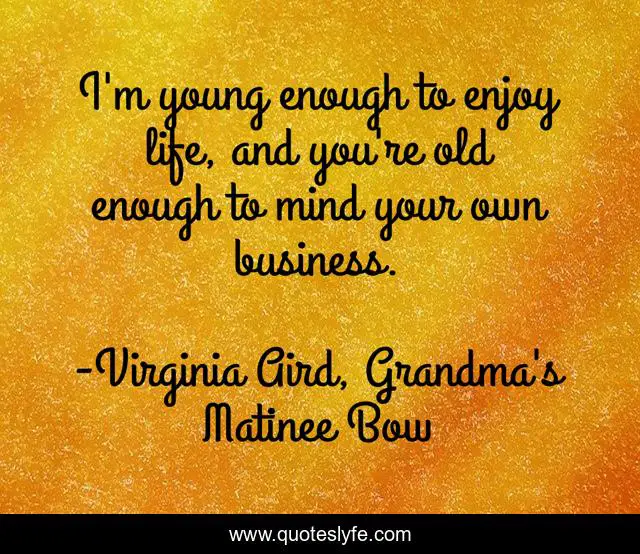 This page presents the quote "I'm young enough to enjoy life, and you're old enough to mind your own business.". Author of this quote is Virginia Aird, Grandma's Matinee Bow. .