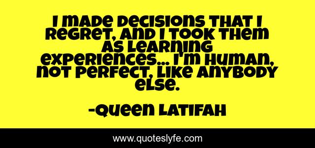 This page presents the quote "I made decisions that I regret, and I took them as learning experiences... I'm human, not perfect, like anybody else.". Author of this quote is Queen Latifah. This quote is about decisions, experience,.