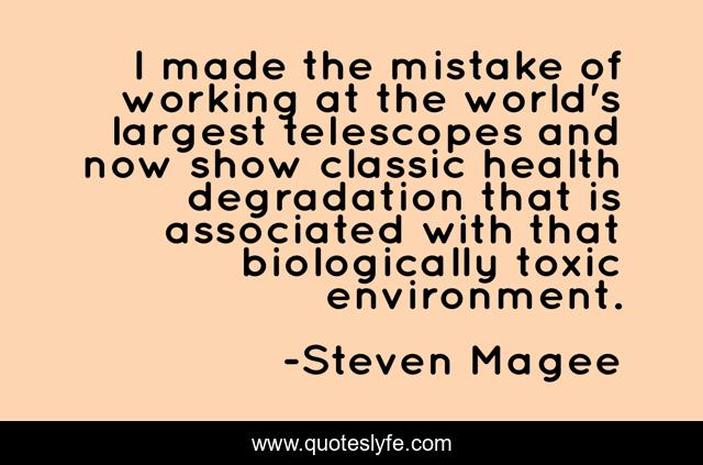 This page presents the quote "I made the mistake of working at the world's largest telescopes and now show classic health degradation that is associated with that biologically toxic environment.". Author of this quote is Steven Magee. This quote is about made, associated, working, show, biologically, classic, degradation, environment, mistake,.