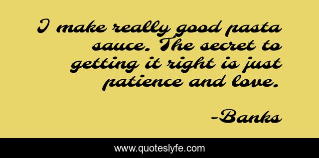 This page presents the quote "I make really good pasta sauce. The secret to getting it right is just patience and love.". Author of this quote is Banks. This quote is about secret, good, love, affection,.