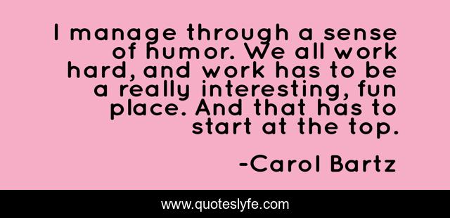This page presents the quote "I manage through a sense of humor. We all work hard, and work has to be a really interesting, fun place. And that has to start at the top.". Author of this quote is Carol Bartz. This quote is about fun, work, work hard,.