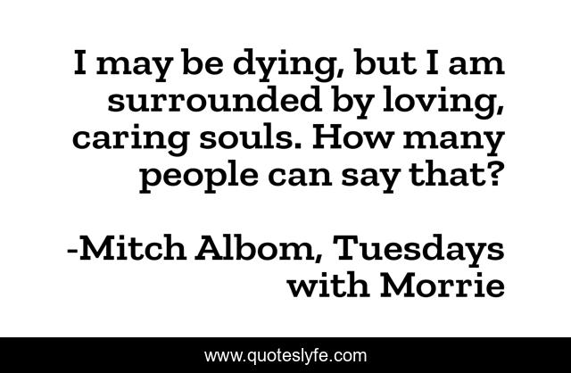 This page presents the quote "I may be dying, but I am surrounded by loving, caring souls. How many people can say that?". Author of this quote is Mitch Albom, Tuesdays with Morrie. This quote is about life, death, love, dying, ill, live, affection, care,.