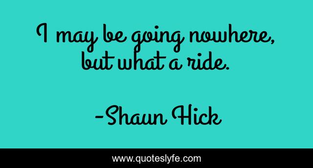 This page presents the quote "I may be going nowhere, but what a ride.". Author of this quote is Shaun Hick. This quote is about distance, life, destiny, travel, seize-the-day, spontaneity, purpose, living-in-the-moment, life-s-journey,.